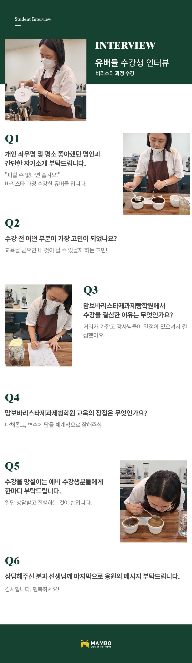 제1조 (개인정보 수집에 대한 동의)맘보교육그룹(이하 회사)는 이용자들이 회사의 개인정보취급방침 또는 이용약관의 내용에 대하여 “동의”버튼 또는 “취소”버튼을 클릭할 수 있는 절차를 마련하여, “동의”버튼을 클릭하면 개인정보 수집에 대해 동의한 것으로 봅니다. 제2조 (개인정보 수집항목) 온라인 문의를 통한 상담을 위해 처리하는 개인정보 항목은 아래와 같습니다. 수집항목 : 성명, 이메일, 전화번호 제3조 (개인정보의 이용목적) 회사는 이용자의 사전 동의 없이는 이용자의 개인 정보를 공개하지 않으며, 원활한 고객상담, 각종 서비스의 제공을 위해 아래와 같이 개인정보를 수집하고 있습니다. 모든 정보는 상기 목적에 필요한 용도 이외로는 사용되지 않으며 수집 정보의 범위나 사용 목적, 용도가 변경될 시에는 반드시 사전 동의를 구할 것입니다. - 성명 : 제품상담에 따른 본인 확인 - 이메일, 전화번호 : 제품상담 및 이벤트 관련 고지사항 전달, 새로운 서비스 및 신상품 정보 제공(DM, SMS, 이메일 등 이용) 이용자는 개인정보의 수집/이용에 대한 동의를 거부할 수 있습니다. 다만, 동의를 거부하는 경우 온라인 문의를 통한 상담은 불가하며 서비스 이용 및 혜택 제공에 제한을 받을 수 있습니다. 제4조 (개인정보의 보유 및 이용기간) 원칙적으로 개인정보 수집 및 이용목적이 달성된 후에는 해당 정보를 지체 없이 파기합니다. 그리고 상법, 전자상거래 등에서의 소비자보호에 관한 법률 등 관계법렵의 규정에 의하여 보존할 필요가 있는 경우 회사는 관계법령에서 정한 일정한 기간 동안 정보를 보관합니다. 이 경우 회사는 보관하는 정보를 그 보관의 목적으로만 이용하며 보존기간은 아래와 같습니다. - 계약 또는 청약철회 등에 관한 기록 : 5년(전자상거래등에서의 소비자보호에 관한 법률) - 소비자의 불만 또는 분쟁처리에 관한 기록 : 3년(전자상거래등에서의 소비자 보호에 관한 법률) - 시용정보의 수집/처리 및 이용 등에 관한 기록 : 3년(신용정보의 이용 및 보호에 관한 법률) - 회사는 귀중한 이용자의 개인정보를 안전하게 처리하며, 유출의 방지를 위하여 다음과 같은 방법을 통하여 개인정보를 파기합니다. - 종이에 출력된 개인정보는 분쇄기로 분쇄하거나 소각을 통하여 파기합니다. - 전자적 파일 형태로 저장된 개인정보는 기록을 재생할 수 없는 기술적 방법을 사용하여 삭제합니다.