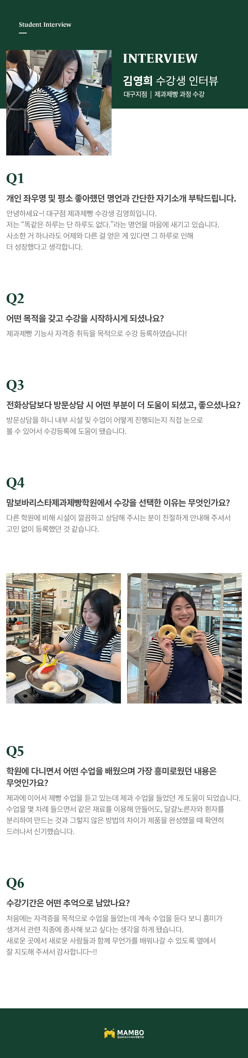 제1조 (개인정보 수집에 대한 동의)맘보교육그룹(이하 회사)는 이용자들이 회사의 개인정보취급방침 또는 이용약관의 내용에 대하여 “동의”버튼 또는 “취소”버튼을 클릭할 수 있는 절차를 마련하여, “동의”버튼을 클릭하면 개인정보 수집에 대해 동의한 것으로 봅니다. 제2조 (개인정보 수집항목) 온라인 문의를 통한 상담을 위해 처리하는 개인정보 항목은 아래와 같습니다. 수집항목 : 성명, 이메일, 전화번호 제3조 (개인정보의 이용목적) 회사는 이용자의 사전 동의 없이는 이용자의 개인 정보를 공개하지 않으며, 원활한 고객상담, 각종 서비스의 제공을 위해 아래와 같이 개인정보를 수집하고 있습니다. 모든 정보는 상기 목적에 필요한 용도 이외로는 사용되지 않으며 수집 정보의 범위나 사용 목적, 용도가 변경될 시에는 반드시 사전 동의를 구할 것입니다. - 성명 : 제품상담에 따른 본인 확인 - 이메일, 전화번호 : 제품상담 및 이벤트 관련 고지사항 전달, 새로운 서비스 및 신상품 정보 제공(DM, SMS, 이메일 등 이용) 이용자는 개인정보의 수집/이용에 대한 동의를 거부할 수 있습니다. 다만, 동의를 거부하는 경우 온라인 문의를 통한 상담은 불가하며 서비스 이용 및 혜택 제공에 제한을 받을 수 있습니다. 제4조 (개인정보의 보유 및 이용기간) 원칙적으로 개인정보 수집 및 이용목적이 달성된 후에는 해당 정보를 지체 없이 파기합니다. 그리고 상법, 전자상거래 등에서의 소비자보호에 관한 법률 등 관계법렵의 규정에 의하여 보존할 필요가 있는 경우 회사는 관계법령에서 정한 일정한 기간 동안 정보를 보관합니다. 이 경우 회사는 보관하는 정보를 그 보관의 목적으로만 이용하며 보존기간은 아래와 같습니다. - 계약 또는 청약철회 등에 관한 기록 : 5년(전자상거래등에서의 소비자보호에 관한 법률) - 소비자의 불만 또는 분쟁처리에 관한 기록 : 3년(전자상거래등에서의 소비자 보호에 관한 법률) - 시용정보의 수집/처리 및 이용 등에 관한 기록 : 3년(신용정보의 이용 및 보호에 관한 법률) - 회사는 귀중한 이용자의 개인정보를 안전하게 처리하며, 유출의 방지를 위하여 다음과 같은 방법을 통하여 개인정보를 파기합니다. - 종이에 출력된 개인정보는 분쇄기로 분쇄하거나 소각을 통하여 파기합니다. - 전자적 파일 형태로 저장된 개인정보는 기록을 재생할 수 없는 기술적 방법을 사용하여 삭제합니다.