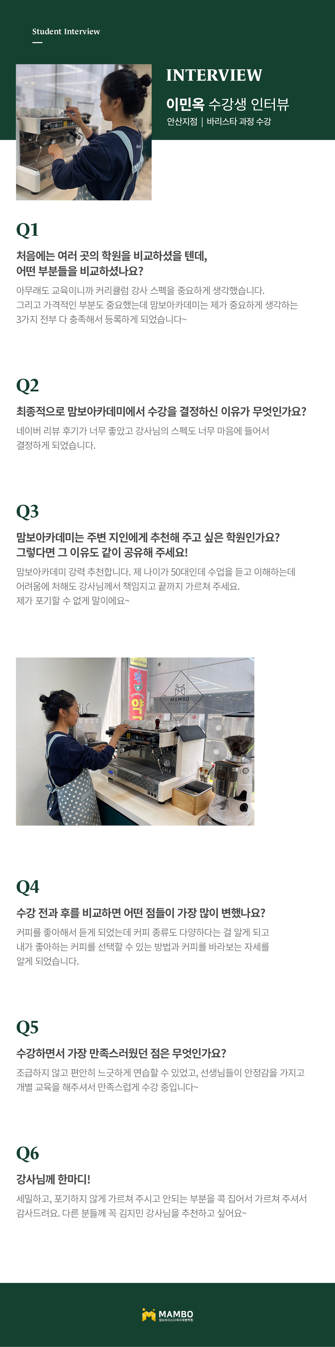 제1조 (개인정보 수집에 대한 동의)맘보교육그룹(이하 회사)는 이용자들이 회사의 개인정보취급방침 또는 이용약관의 내용에 대하여 “동의”버튼 또는 “취소”버튼을 클릭할 수 있는 절차를 마련하여, “동의”버튼을 클릭하면 개인정보 수집에 대해 동의한 것으로 봅니다. 제2조 (개인정보 수집항목) 온라인 문의를 통한 상담을 위해 처리하는 개인정보 항목은 아래와 같습니다. 수집항목 : 성명, 이메일, 전화번호 제3조 (개인정보의 이용목적) 회사는 이용자의 사전 동의 없이는 이용자의 개인 정보를 공개하지 않으며, 원활한 고객상담, 각종 서비스의 제공을 위해 아래와 같이 개인정보를 수집하고 있습니다. 모든 정보는 상기 목적에 필요한 용도 이외로는 사용되지 않으며 수집 정보의 범위나 사용 목적, 용도가 변경될 시에는 반드시 사전 동의를 구할 것입니다. - 성명 : 제품상담에 따른 본인 확인 - 이메일, 전화번호 : 제품상담 및 이벤트 관련 고지사항 전달, 새로운 서비스 및 신상품 정보 제공(DM, SMS, 이메일 등 이용) 이용자는 개인정보의 수집/이용에 대한 동의를 거부할 수 있습니다. 다만, 동의를 거부하는 경우 온라인 문의를 통한 상담은 불가하며 서비스 이용 및 혜택 제공에 제한을 받을 수 있습니다. 제4조 (개인정보의 보유 및 이용기간) 원칙적으로 개인정보 수집 및 이용목적이 달성된 후에는 해당 정보를 지체 없이 파기합니다. 그리고 상법, 전자상거래 등에서의 소비자보호에 관한 법률 등 관계법렵의 규정에 의하여 보존할 필요가 있는 경우 회사는 관계법령에서 정한 일정한 기간 동안 정보를 보관합니다. 이 경우 회사는 보관하는 정보를 그 보관의 목적으로만 이용하며 보존기간은 아래와 같습니다. - 계약 또는 청약철회 등에 관한 기록 : 5년(전자상거래등에서의 소비자보호에 관한 법률) - 소비자의 불만 또는 분쟁처리에 관한 기록 : 3년(전자상거래등에서의 소비자 보호에 관한 법률) - 시용정보의 수집/처리 및 이용 등에 관한 기록 : 3년(신용정보의 이용 및 보호에 관한 법률) - 회사는 귀중한 이용자의 개인정보를 안전하게 처리하며, 유출의 방지를 위하여 다음과 같은 방법을 통하여 개인정보를 파기합니다. - 종이에 출력된 개인정보는 분쇄기로 분쇄하거나 소각을 통하여 파기합니다. - 전자적 파일 형태로 저장된 개인정보는 기록을 재생할 수 없는 기술적 방법을 사용하여 삭제합니다.